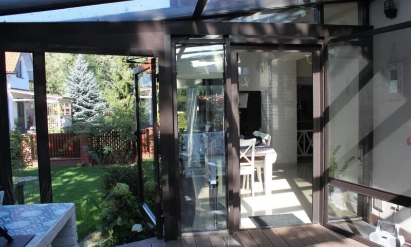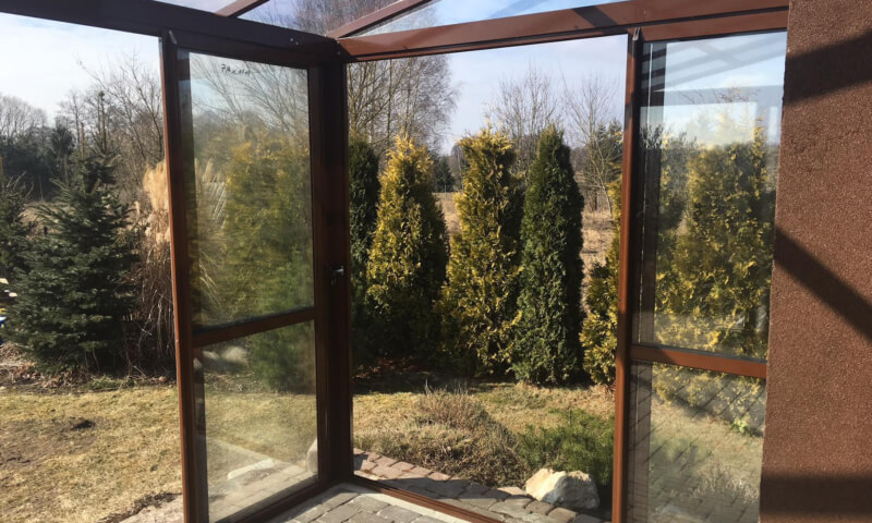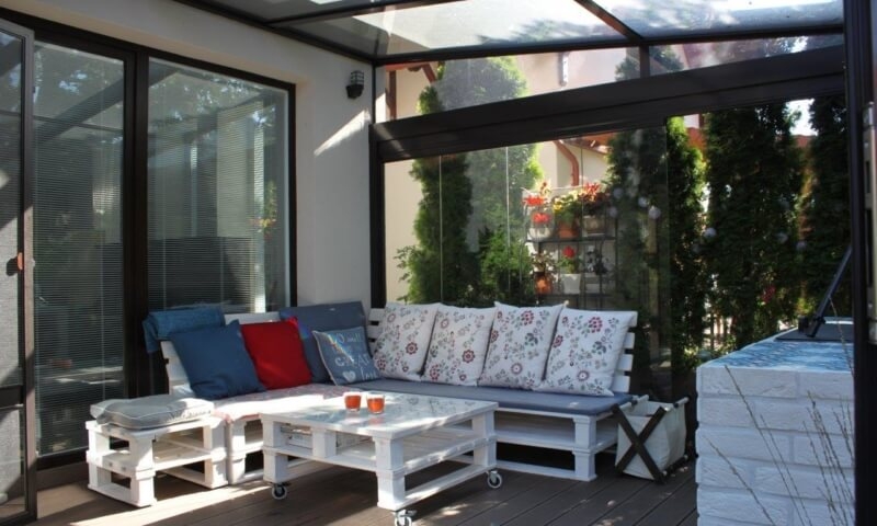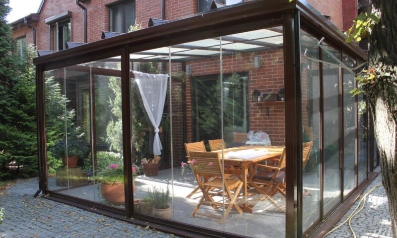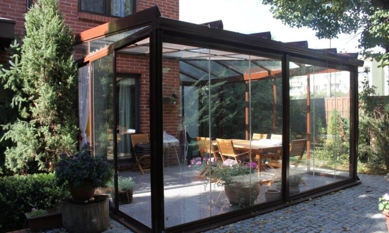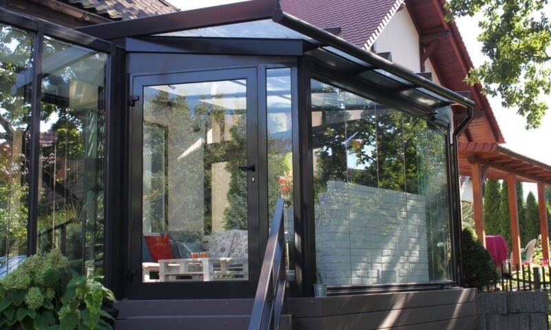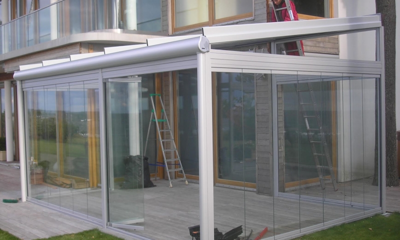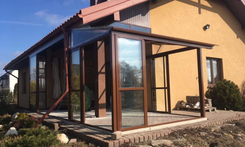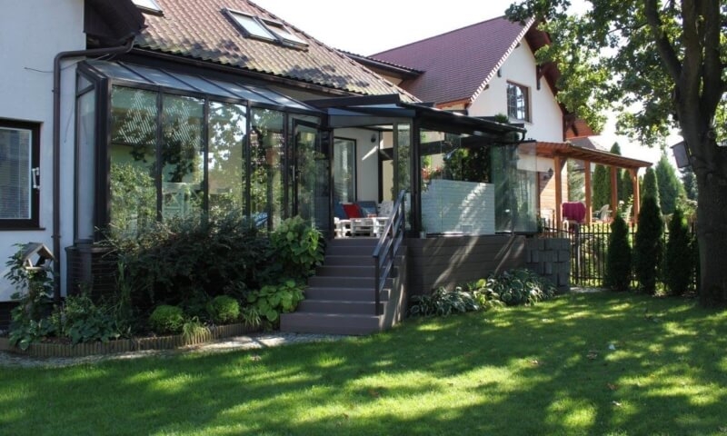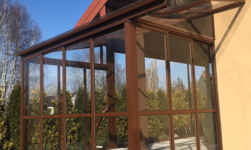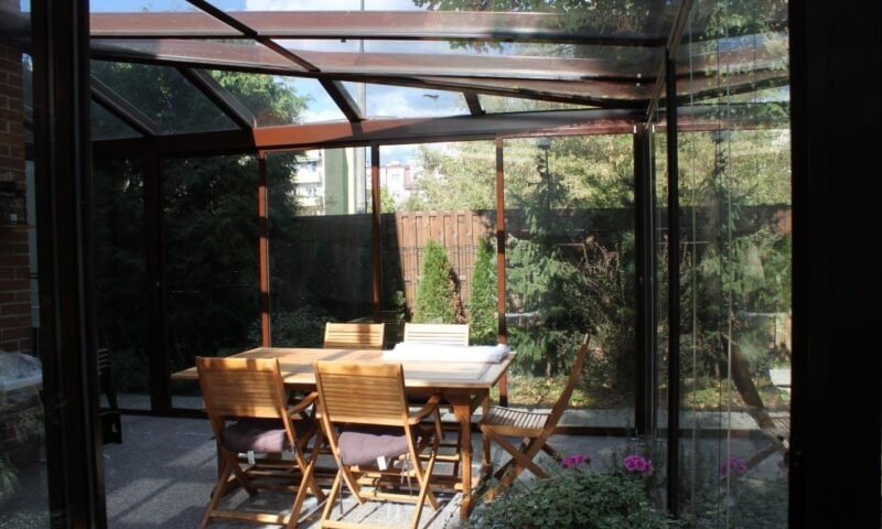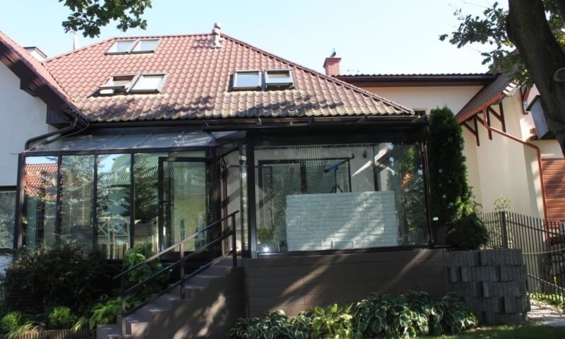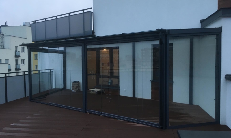 Drugim krokiem, umożliwiającym korzystanie z tarasu przez cały rok to zamkniecie tarasu ściankami ze szkła i aluminium.